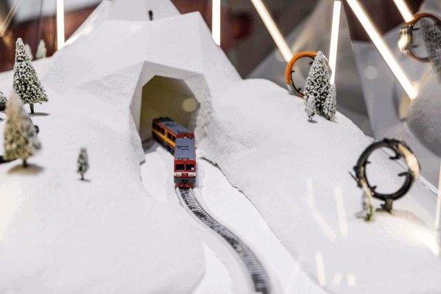 環(huán)形軌道上也有一輛輛纜車(chē)整裝待發(fā),帶你飛越雪山。湊近細(xì)看,窗內(nèi)竟是精彩各異的天梭腕表。