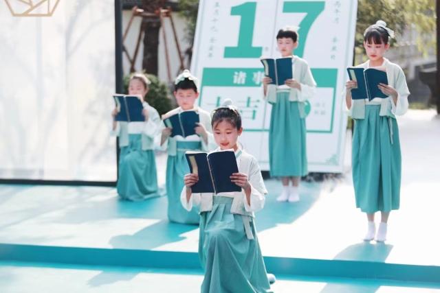 “少小離家老大回,鄉(xiāng)音無改鬢毛衰......”伴隨著悠揚的琴聲,一群穿著傳統(tǒng)服飾的小朋友們將《回鄉(xiāng)偶書》緩緩吟誦,讓人沉醉其中。舞臺另一側(cè),一位演員化身暮遲時返回故土的賀老,與臺下對話:“久別的故鄉(xiāng),我回來了!你還記得我賀知章嗎?”