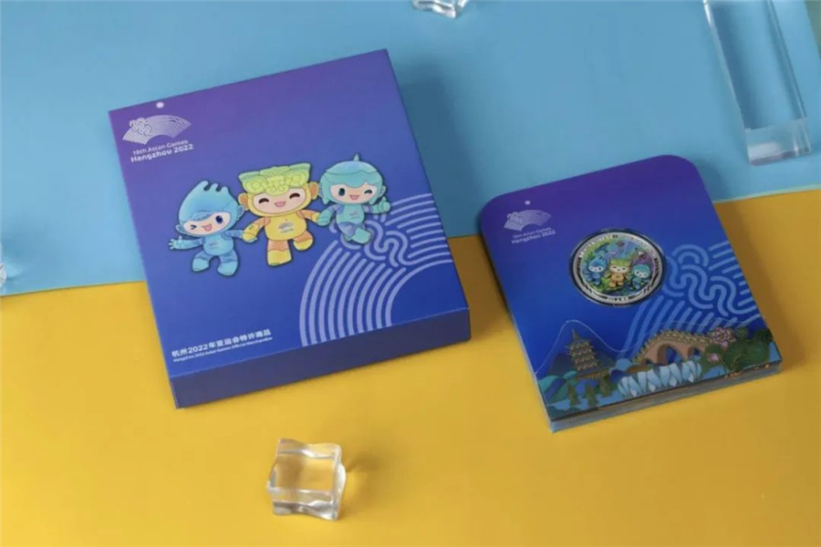 金章主體圖案為運動會吉祥物組合,配圖由音樂智能符號、綠色節(jié)儉之樹等元素組成,充分展現(xiàn)了辦賽理念、亞運文化以及當(dāng)代中國的時代創(chuàng)新精神。