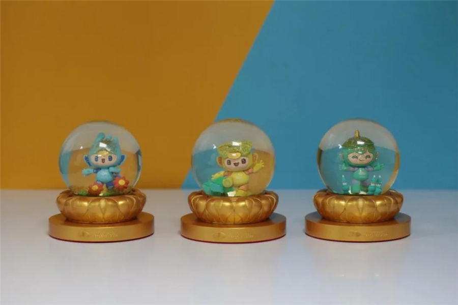 琮琮、宸宸、蓮蓮三個吉祥物在水晶球中歡慶亞運會的到來,水晶球中金色的彩片上下飛舞,金光閃爍,祝福著各國運動健兒在本屆亞運會中都能展現(xiàn)自我,挑戰(zhàn)自我,取得佳績。
