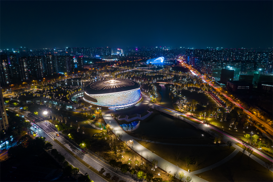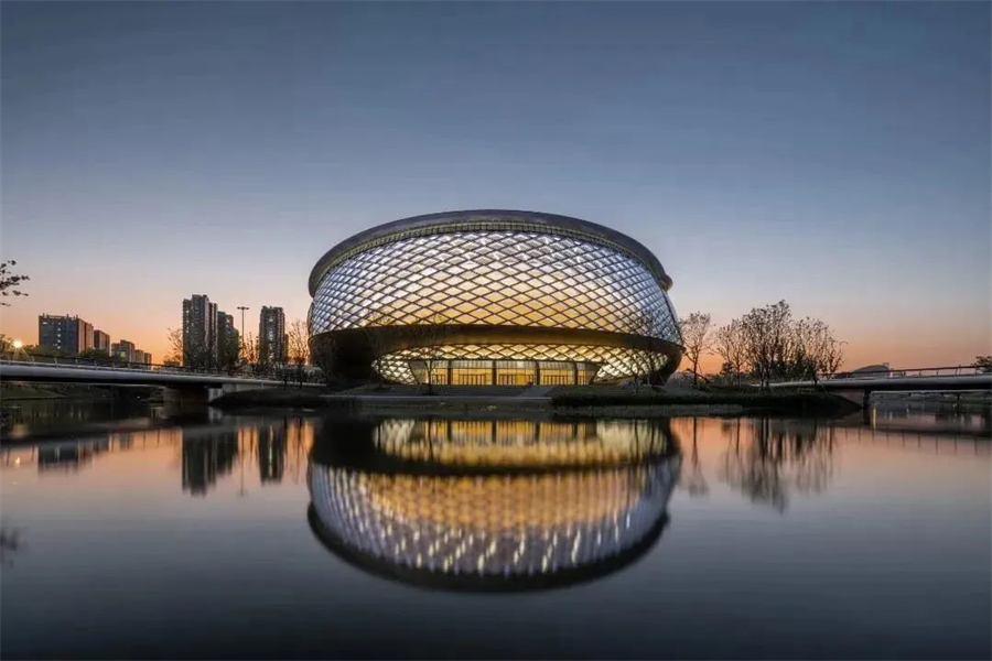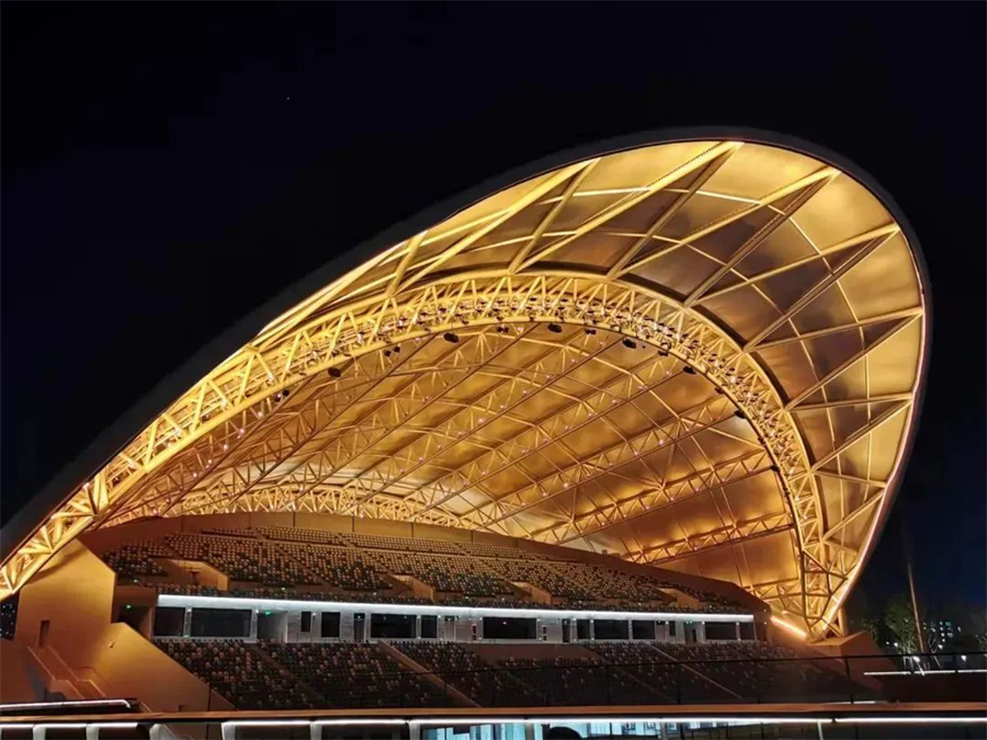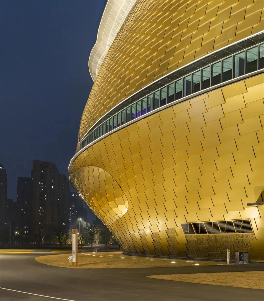 位于公園北區(qū)的體育場,巨大的“杭州傘”屋蓋隨著時間的推移,在不同色彩間來回變幻,整體建筑像極了江南女子手中一把撐開的油紙傘,靜靜地放置在公園一角。
